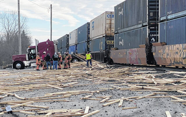 According to the Versailles Police Department, it is believed the semi-tractor pulling a flat bed trailer loaded with lumber was attempting to make the crossing when the the trailer became stuck on the tracks. The trailer was then struck by a westbound CSX train spreading debris across the area and lodging the trailer in front of the CSX engine.